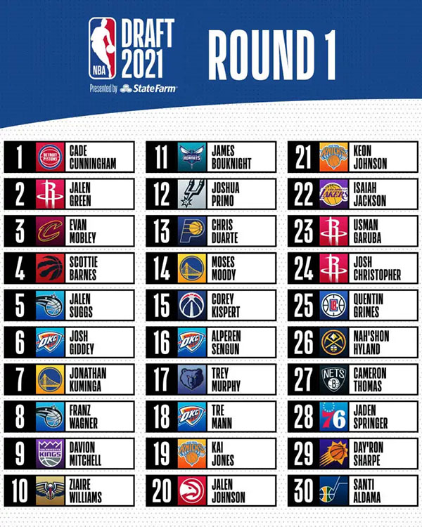 来源:24直播网06-07 11:4324直播网讯 2021年3月30日,NBA公布,2021年NBA选秀大会将在北京时间2021年7月30日在篮网主场巴克莱中心举行,于当日8:00正式开始。NBA还公布了关于2021年NBA选秀大会其它事宜的日期。那么2021年NBA选秀大会首轮被选中的球员有哪些呢?跟随小编一起来了解下吧!