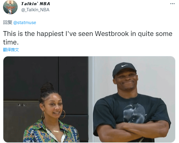 对于湖人新帅的夸赞,美媒调侃威少听到哈姆的评价后变成全力詹;美媒Talkin NBA晒出威少在现场抿着嘴大秀的画面,配文写道:这是我很长一段时间以来看到威少最开心的一次。