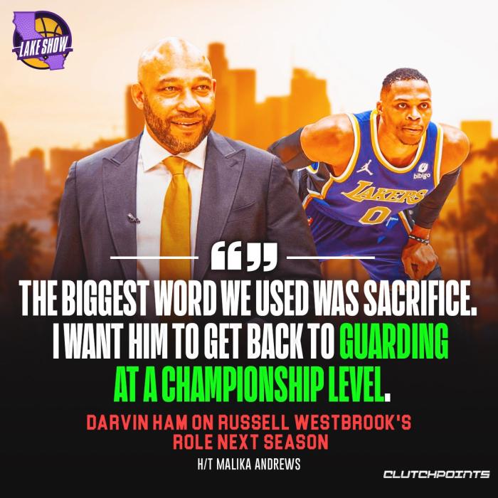 对于威少新赛季的角色,哈姆表示:威少绝对是球队未来的关键部分之一,哈姆还说他已经和威少交谈过了,提到最多的词就是牺牲;哈姆还表示希望威少在防守端为球队奠定基调,希望威少能恢复到总冠军级别的防守表现。