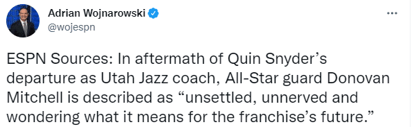 斯奈德做出离职的决定,对此爵士球星米切尔的未来令人担忧,据沃纳罗斯基报道,米切尔对斯奈德的离开感到不安、失望和吃惊,不知道这对未来意味着什么;美媒Clutch Points认为这是米切尔想要离队的信号,晒出米切尔改穿猛龙、热火、独行侠和尼克斯四队球衣的P照。