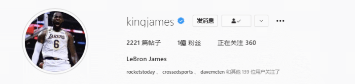 詹姆斯是NBA史上拥有Ins粉丝最多的球星,如今Ins粉丝破亿再创历史新高。
