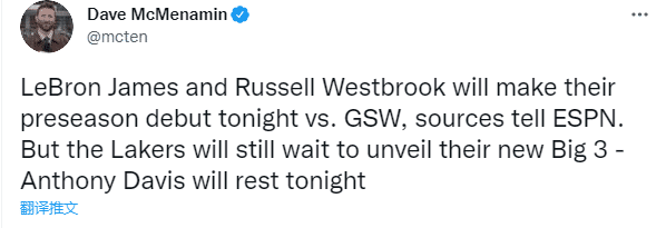 此前沃格尔曾表示詹姆斯和威少至少打两场季前赛,预计湖人对阵勇士,詹威大概率只打上半场,毕竟季前赛的输赢并不重要,重在磨合阵容、让球星找状态以及确定常规赛大名单。