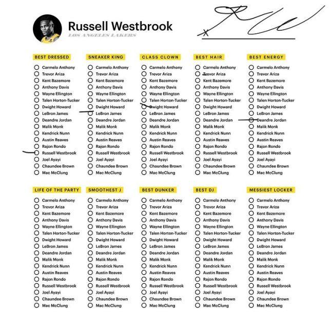 媒体日当天,湖人官方组织了一项有趣的投票活动,票选队内的10大奖项:最佳着装、鞋王、耍宝王、最佳发型、最佳能量、派对王、最佳投手、最佳扣将、最佳DJ、最乱更衣柜。此前,两个奖项已经揭晓,詹姆斯9票当选鞋王,阿里扎6票拿下最佳发型奖,如今威少以9票拿下最佳着装奖。