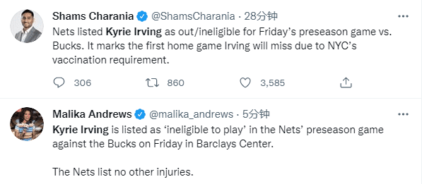 篮网队内没有任何伤病,但欧文仍将缺席篮网在主场对阵雄鹿的比赛,由于纽约规定参加多人活动必须要接种疫苗,而欧文一直拒绝接种疫苗,因此他无法参加篮网主场的比赛,此前欧文也因同样的原因缺席了队内的训练;目前,篮网仍旧不知道欧文是否最终会接种疫苗,他的决定将是篮网冲冠的一大隐患。