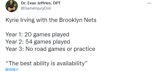 杜兰特和哈登都支持欧文,但欧文的决定将对篮网未来产生很大的影响——若欧文不接种疫苗,他将至少缺席43场在纽约的比赛,这肯定会影响球队的计划;自从加盟篮网以来,欧文第一年打了20场比赛,第二年打了54场比赛,第三年因拒绝接种疫苗而无法参加主场的比赛,Evan Jeffrise评价:欧文最好的能力是可用性。