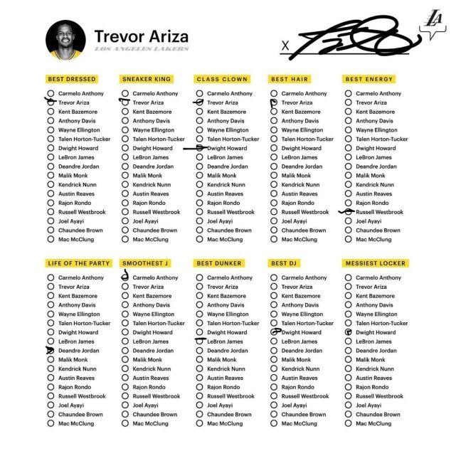除了宣布阿里扎得到最佳发型奖的消息,湖人官方还公布了阿里扎的投票情况。在其中四项上,他投给了自己,分别是最佳着装、鞋王、耍宝王、最佳发型。其中,耍宝王一栏是双选,除了自己他还投给了霍华德。