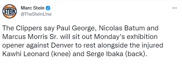 快船官方已经宣布季前赛首战的伤病报告,乔治、巴图姆和小莫里斯都轮休不打、伊巴卡(背伤)和普雷斯顿(右脚受伤)因伤缺阵,快船球星小卡(十字韧带部分撕裂)也确定无法出战。