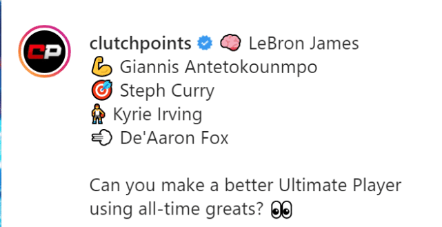 clutchpoints确实选取了一些巨星的优势,组成了他们眼中的最强合体。詹姆斯一直被认为是联盟里最聪明的球星之一,他在球场内外的判断力和决策力,都是顶尖级别的。欧文则被视为史上最强控球手,眼花缭乱的控球,真的很难有人比肩。字母哥在总决赛打爆了太阳的内线,“希腊怪兽”确实拥有恐怖的体格。至于库里的投射,福克斯的速度,也都是得到绝对认可的。