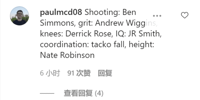 和正儿八经的评论相比,一些调侃也很有趣。有球迷写道:“西蒙斯的投射、维金斯的意志力、罗斯的膝盖、JR-史密斯的智商、法尔的协调性和内特-罗宾逊的身高。”显然,这位球迷把一些球员的缺陷都列出来,他们组成的终极球员又会如何?