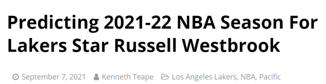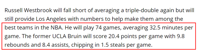 来源:24直播网09-08 19:2324直播网9月08日讯湖人新赛季的阵容有很大变化,威少是最受关注的一张新面孔。2021-22赛季,他能在湖人打出怎样的数据呢?北京时间9月8日, 美媒nbaanalysis给出了他们的预测——