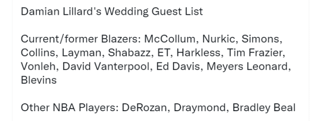 利拉德的这次婚礼,请了不少圈内人士。此前有美媒晒出利拉德邀请的NBA球员名单,除了大量的开拓者现队友和前队友,还有利拉德在其他NBA球队的好朋友:公牛的德罗赞、勇士的格林和奇才的比尔。大家盛装出席利指导的婚礼,载歌载舞,为他送上祝福。