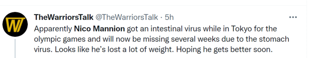 消息人士透露,这张照片拍摄于几天前,由于病毒的原因,曼尼恩减重不少。据悉他在东京奥运会期间感染了这一病毒,过去几周一直受到困扰。现在,他的病情已经有所好转。