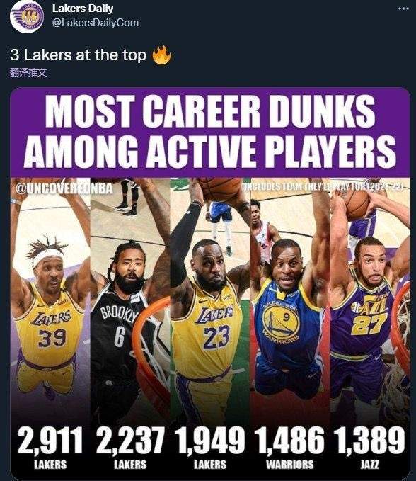 霍华德是现役扣篮数量最多的球员,一共扣篮次数达到了2911次。要知道霍华德在奇才队的时候还接近一个赛季没有打球,在火箭时期也是遭遇背部伤病的困扰。然而霍华德依然是排在了扣篮次数排行榜的第一位,不得不说他的扣篮能力十分强大。而且霍华德还拥有着扣篮王这样的关于扣篮的顶级奖项。新赛季霍华德再次来到湖人,这支球队有隆多、威少、詹姆斯,就意味着霍华德新赛季的扣篮数量绝对不会少。毕竟他的个人能力摆在这里,只要传球舒服,霍华德就能够贡献扣篮。