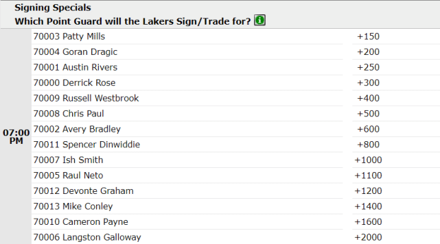 来源:24直播网07-24 11:0524直播网讯 北京时间7月24日,湖人的休赛期目标之一,就是引进一位有经验的控卫,无论是通过签约还是交易的方式。如今,湖人控卫引援赔率也正式出炉。赔率榜上,高居首位的是马刺后卫帕蒂-米尔斯,罗斯、威少、保罗、丁威迪的名字也都在列。