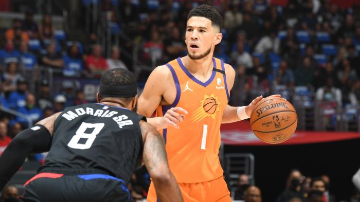 下半场,保罗和布克带队最多领先到17分,布克再次上演技惊四座的劈扣,期间暂停时,布克拿着战术板安排战术;不过太阳突然哑火,乔治带队打出10-0反扑高潮,小莫里斯和巴图姆立功;暂停回来,保罗强势回应三分,随后布克防守时被乔治肘击到面部,这仍旧是普通犯规。