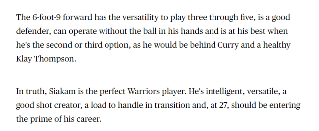 NBC体育认为,这是勇士期待的交易,因为西亚卡姆很适合勇士的体系。“这位身高6英尺9英寸的前锋,能从三号位打到五号位,是一个不错的防守者,能打无球,当他是球队的第二或者第三选择时,往往能发挥最出色的水准。在勇士队,他可以成为库里和汤普森之后的得分点。”NBC体育还认为西亚卡姆打球很聪明而且全能,能创造机会,而且他才27岁,正进入生涯的巅峰期。