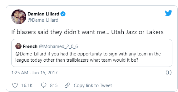 2014年2月13日,利拉德发推写道:我爱洛杉矶;2017年6月15日,球迷问除了开拓者,利拉德最想去哪支球队?利拉德回应:如果开拓者不想要我了,我想去爵士或者湖人。