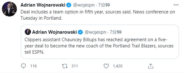 来源:24直播网06-28 14:3324直播网讯北京时间6月28日,开拓者新教练正式确定下来,据espn名记沃纳罗斯基报道,昌西-比卢普斯已经和开拓者签下一份5年执教合同——4年保障性合同和第5年球队选项,这是5年合同的一些细节,合同的具体金额暂未曝光。