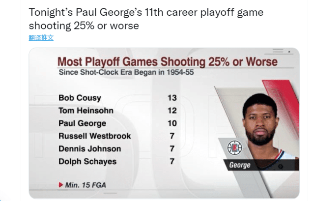 值得一提的是,这是保罗乔治季后赛生涯第11次打出命中率不高于25%的比赛,NBA自1954-55赛季以来,仅次于鲍勃库西的13次和汤姆海因索恩的12次。现役第二是威少,但也不过只有7次。所以毫不夸张地说,泡椒在这方面的拉胯可以说是现役“独一档”!