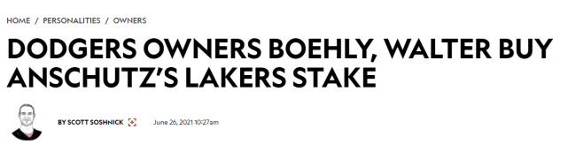 在这笔交易完成前,安舒茨是湖人的第二大股东,仅次于巴斯家族(拥有66%的股份)。如今,安舒茨决定卖掉自己手中的湖人全部27%股份。Soshnick推测,考虑到湖人目前的市场估值,27%的股份预计成交价在13.5亿美元左右。这笔交易正式完成后,马克-沃尔特和托德-伯利将成为湖人的第二大股东,也是持有湖人股份最多的小老板。