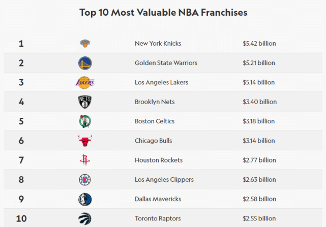 根据Sportico的报道,湖人的最新市场估值是51.4亿美元,仅次于尼克斯(54.2亿)和勇士(52.1亿),位居联盟第三位。上图是目前市场估值排名联盟前十的球队,分列第4-10位的依次是篮网(34亿)、凯尔特人(31.8亿)、公牛(31.4亿)、火箭(27.7亿)、快船(26.3亿)、独行侠(25.8亿)和猛龙(25.5亿)。