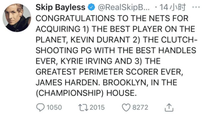 Skip数千次嘲讽詹姆斯,那么说詹姆斯回应过他几场呢?不同于皮蓬点评杜兰特不如詹皇,KD很快就回怼了过去。面对Skip的嘲讽,詹姆斯一次都没有回应过这位头号詹黑。