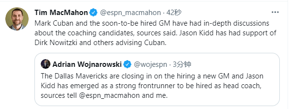 名记麦克马洪补充报道,马克-库班和即将被聘用的总经理已经就教练候选人进行了深入讨论。杰森-基德得到了德克-诺维茨基(特别顾问)和其他为库班提供建议的人的支持;这意味着独行侠即将挖走湖人助教,基德已经成为独行侠新帅的头号人选。