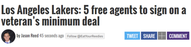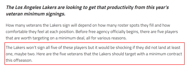来源:24直播网06-24 14:5824直播网讯 季后赛首轮出局,湖人势必需要补强阵容。不过,受限于薪金空间,老将底薪合同将是佩林卡在休赛期的主要签约模式。北京时间6月24日,洛城媒体Lakeshowlife列出了五大底薪签约的目标,并指出湖人不会签下所有这五位球员,但如果他们没有至少签下其中一两位,那将是令人惊讶的。