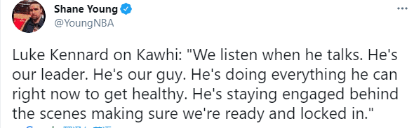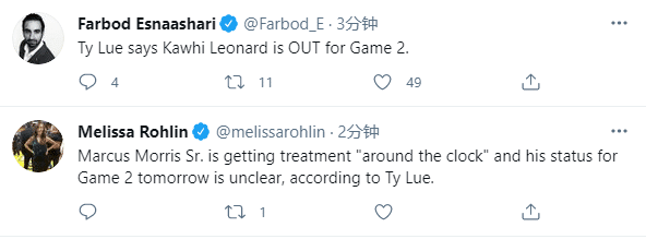 泰伦卢表示他不知道小卡的康复情况,只是得到了小卡缺席西决第二战的消息,根本不知道何时才能复出;不过小卡伤停也没闲着,在家仍旧专注于比赛,泰伦卢透露小卡每天都和球员聊天,竭尽全力地远程帮助教练组;祖巴茨透露小卡在中场休息时,与球队调整进行了谈话。
