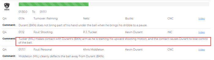 首先是第四节比赛最后1分12秒,当时雄鹿107-105领先,篮网进攻回合,杜兰特右侧运球进攻,皮球被塔克切球,随后米德尔顿抢断反击造成犯规,随后两罚命中,裁判报告显示,塔克的切球打到了杜兰特的手,杜兰特本应该获得2次两次罚球,从杜兰特造犯规被漏吹,篮网本有机会获得2分,到米德尔顿反击造犯规获两罚,这个回合篮网一里一外丢了4分