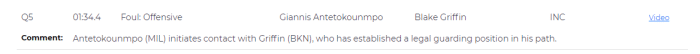加时赛还剩下1分25秒,篮网111-109领先时,字母哥右路突破撞到了格里芬,后者被吹罚了阻挡犯规,随后六犯离场,裁判报告显示,字母哥主动撞上了格里芬,后者已经建立了防守位置,这一球应该吹罚进攻犯规。值得一提的是格里芬下场后,篮网失去了防守字母哥的最好人选,在加时赛中被字母哥打进一记关键抛投,如果当时纳什选择挑战这一球,杜兰特不但能够获得休息时间,格里芬也不会六犯,纳什到最后也没有使用挑战