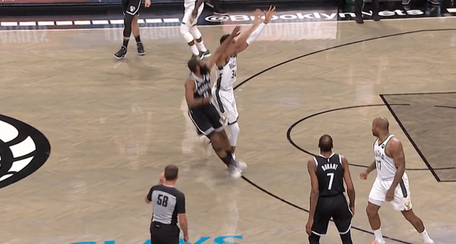 字母哥在系列赛中的第一次垫脚就已经被很多球迷质疑,毕竟抢篮板把推分得那么开的职业球员也就字母哥一个吧。字母哥的这一次垫脚,搞定了欧文,也差点搞定了系列赛,所幸的是杜兰特的神奇表现,否则字母哥可能也不用再一次出现垫脚的争议。