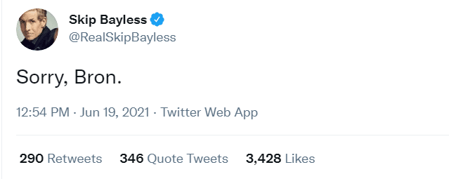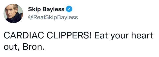 贝勒斯以前就曾经穿着快船2号上节目。今天他也换上了快船的球帽,穿上了快船的球衣,拍摄视频庆祝快船晋级,也没忘了他的“詹黑”人设定位,讽刺了一番同在洛杉矶的詹姆斯。去年的冠军湖人本赛季受困于伤病,首轮就被淘汰出局。“对不起,布朗(詹姆斯),”贝勒斯写道:“快船比你强多了,布朗。”