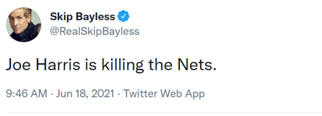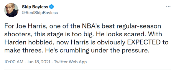 贝勒斯还写道:“乔-哈里斯是NBA常规赛最好的投手之一,但这个舞台对他而言太大了。他看上去很害怕。哈登步履蹒跚,大家都希望哈里斯能够命中三分,可是他在压力下要崩溃了。”