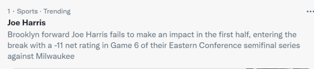 其实,这轮系列赛的G1和G2,哈里斯的手感不错,三分球9中5和7中3,篮网也连续赢下两场比赛。但是从G3开始,哈里斯的手感冰凉。G3的三分球7中1,G4的三分球6中2,G5的三分球7中1,G6的三分球也只有4中1。算下来,近4场比赛,哈里斯三分球24中5,三分命中率只有可怜的20.8%。