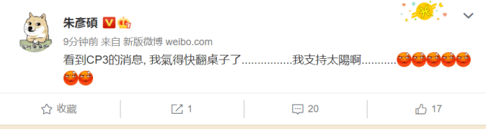 保罗这件事直接引爆了网络冲上了微博热搜,宝岛名嘴朱彦硕直接发微博爆粗口“看到CP3的消息,我气得快翻桌子了”谁都不希望发生这样的事情,本来太阳本赛季表现这么好,保罗这么出色,大家都期待他们去冲击更高的成绩,但这件事一发生,一切都有变数了!