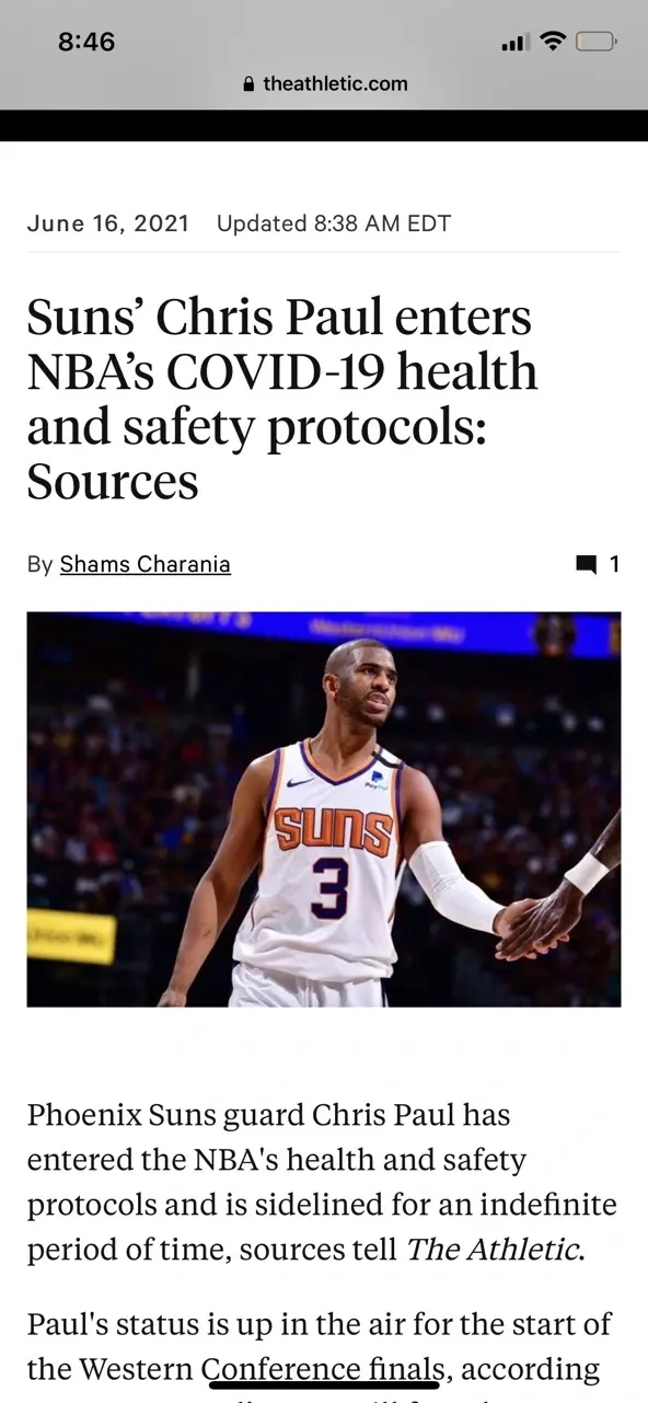 来源:24直播网06-17 11:2524直播网讯 北京时间6月16日,名记Shams突然爆料爆炸性新闻,太阳核心控卫克里斯保罗因为触发了联盟健康与安全协议,将会无限期缺阵!