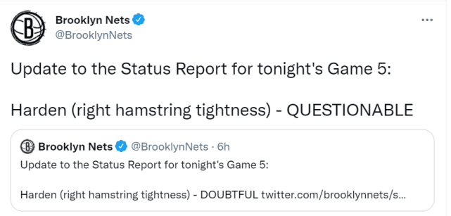 哈登的腿筋状况也确实在不断好转,篮网官方原本提前一天就把他的G5状态列为OUT(缺席),但在过去的几个小时,篮网官方不断升级哈登的出战状态。先是从OUT变成DOUBTFUL(小概率出战,上场概率25%),又从DOUBTFUL变成QUESTIONABLE(出战成疑,上场概率50%)。