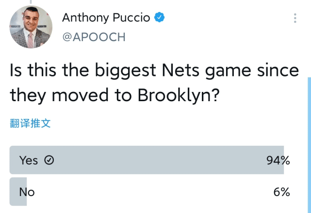 天王山之战的重要性不言而喻,篮网跟队记者Anthony Puccio发起了一次球迷在线投票,调查这场比赛是否是篮网搬到布鲁克林以后最重要的一场球,结果94%的球迷选择“是”。