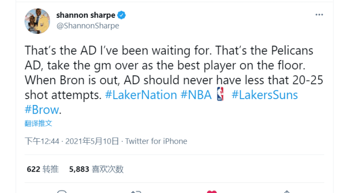 记香shannon sharpe:这是我一直期待的AD!这是鹈鹕形态的AD,作为场上最好的球员接管了比赛!当勒布朗不打,戴维斯永远不应该出现出手数低于20-25次的情况!