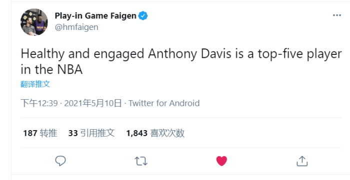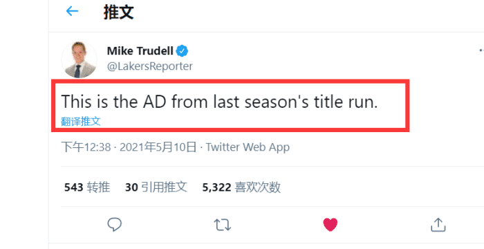 名记Mike Trudell:AD打出了去年季后赛夺冠之旅的状态!