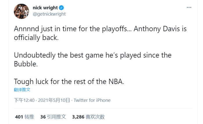 名记nick wright:刚好赶在季后赛到来之前,浓眉哥强势回归!这场毫无疑问是他自去年季后赛以来打得最好的一场比赛!对于NBA其他球队来说太不走运了!