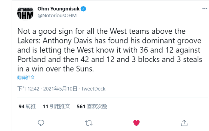 “这对于战绩在湖人之上的所有西部球队来说不是一个好兆头,浓眉哥找回了他的统治状态,而且在接连对阵开拓者和太阳的比赛中让西部知道了这一点!”