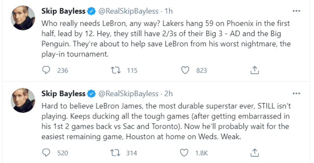 第二条动态,贝勒斯应该是在湖人和太阳半场结束时发出的。他写道:“谁真正需要勒布朗?湖人上半场得到59分,领先太阳12分。嘿,他们仍然拥有三巨头中的两位:AD和大企鹅(庄神)。他们将帮助詹姆斯逃避最糟糕的噩梦——附加赛。”