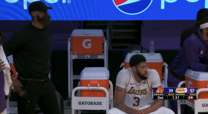 当浓眉下场休息时,詹姆斯主动走到浓眉的面前,老詹甚至走上球场和浓眉沟通;第二节还剩2分多钟,浓眉坐回替补席,詹姆斯一直在浓眉附近溜达,一有机会就和浓眉互动;浓眉重新上场后,老詹站在场边观战,湖人半场59-47依旧领先两位数。