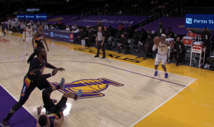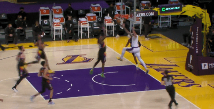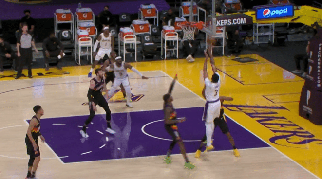 这是首节中段,湖人反击,朗多长传球找到浓眉哥,浓眉哥接球之后直接选择上篮,没想到的是被防守的保罗直接封盖。克雷格得球之后给到保罗推动进攻,可惜这次太阳的进攻没有命中。