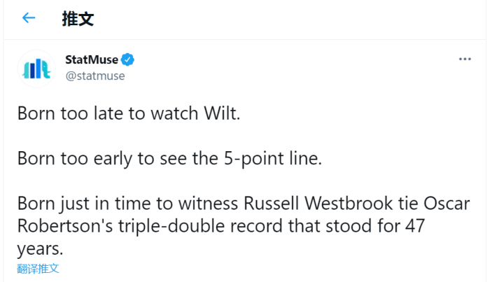 美媒statmuse盛赞:没有看过张伯伦打球,也还没有机会看到5分球时代的到来,但正好见证了韦少追平罗伯特森的三双纪录,一个尘封了47年的纪录!