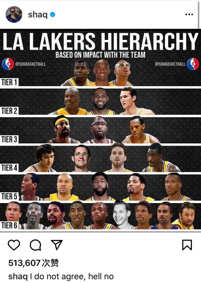 来源:24直播网05-09 15:0724直播网讯 北京时间5月9日,前湖人名宿奥尼尔在社媒上晒出了一张由媒体制作的湖人队史球员分档图,分档基于他们的荣誉、带队能力、影响力等多个因素,奥尼尔附文“我不同意,绝不。”