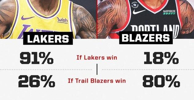据美国权威网站的计算,如果湖人赢下今日对决,他们有91%的机会最终拿到西部前6,避免打附加赛,开拓者则只剩下18%,如果开拓者胜,他们有80%的机会最终西部前六,湖人则只剩下26%。能进入前六的好处就是不用打附加赛,锁定一个季后赛席位,还能让球员获得一定程度的休息时间,提前进入备战季后赛阶段!