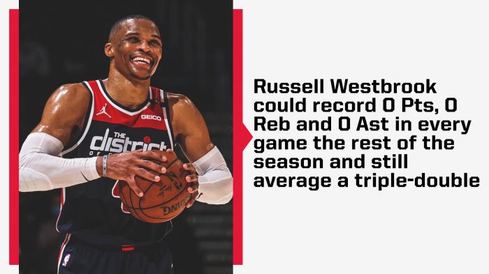 目前韦少已经提前锁定场均三双的神迹,生涯第四次赛季场均三双;33次三双也是提前锁定赛季三双王,毕竟韦少遥遥领先约基奇(15次),这奖项已经没悬念了;另外韦少场均11.2次助攻领跑助攻榜,有望夺得生涯第3个助攻王。